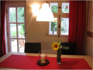 Küche mit Essplatz und Zugang zur großen Terrasse; komplett ausgestattete Vollholzküche und Esstisch von
